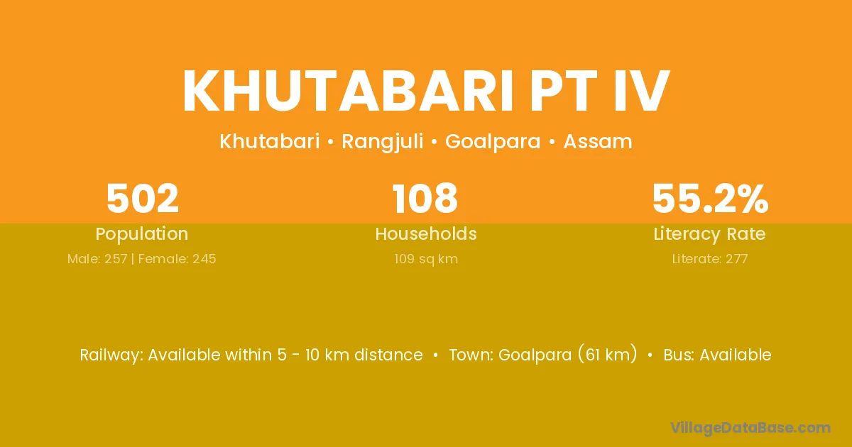 Khutabari Pt Iv village has a total population of 502 people, of which 257 are males and 245 are females.