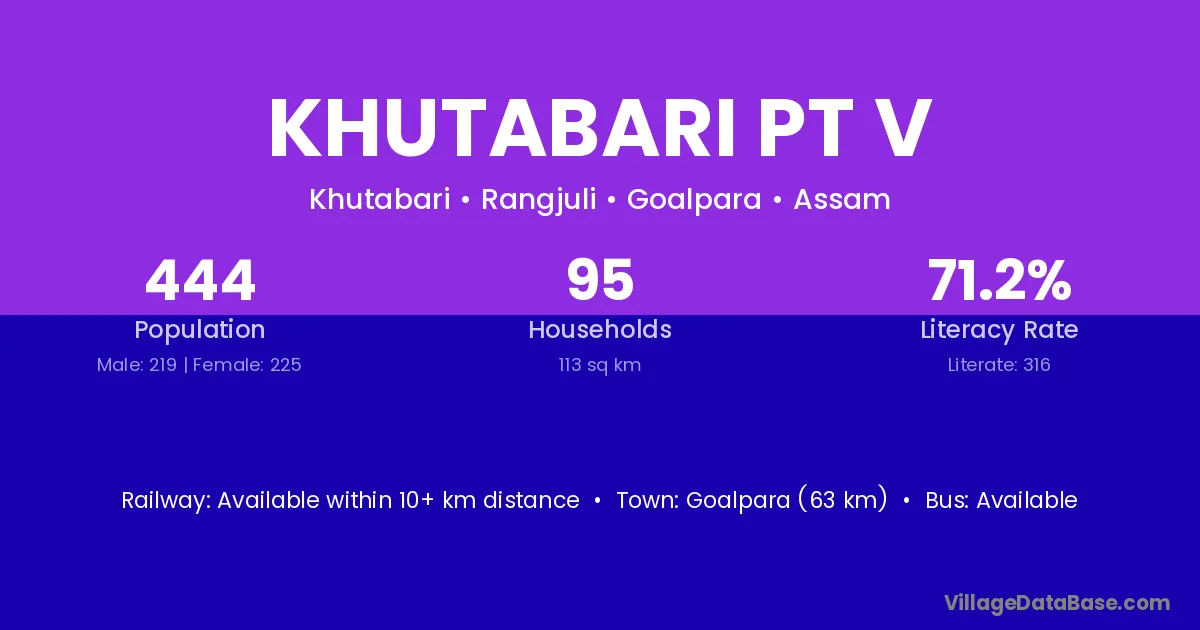 Khutabari Pt V village has a total population of 444 people, of which 219 are males and 225 are females.