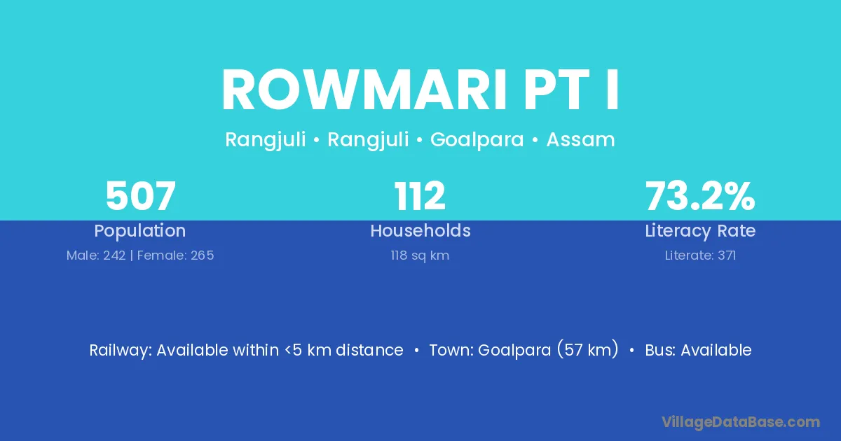 Rowmari Pt I village has a total population of 507 people, of which 242 are males and 265 are females.