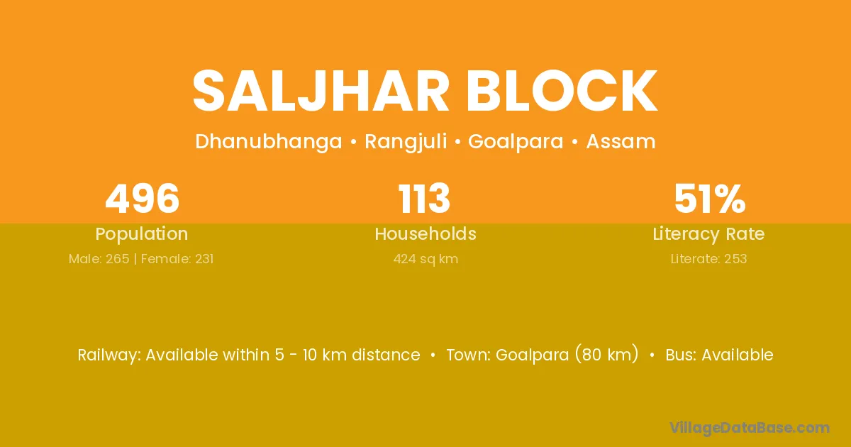 Goalpara (80 km) is the nearest town to Saljhar Block village for major economic activities and is located approximately 80 km away.