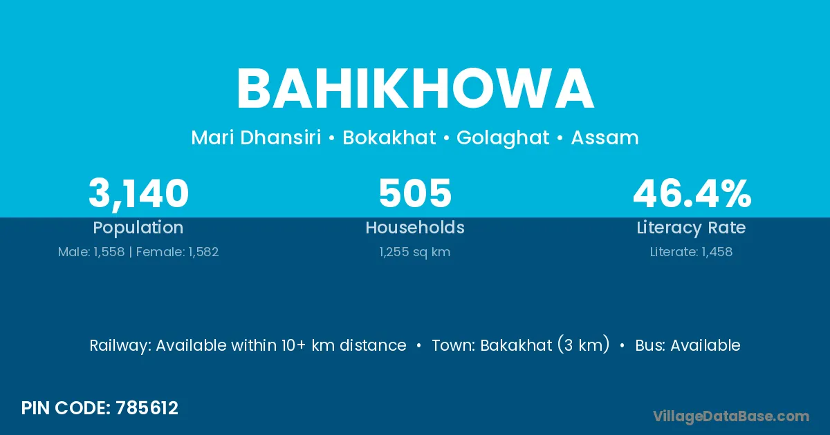 Bahikhowa village has a total population of 3,140 people, of which 1,558 are males and 1,582 are females.