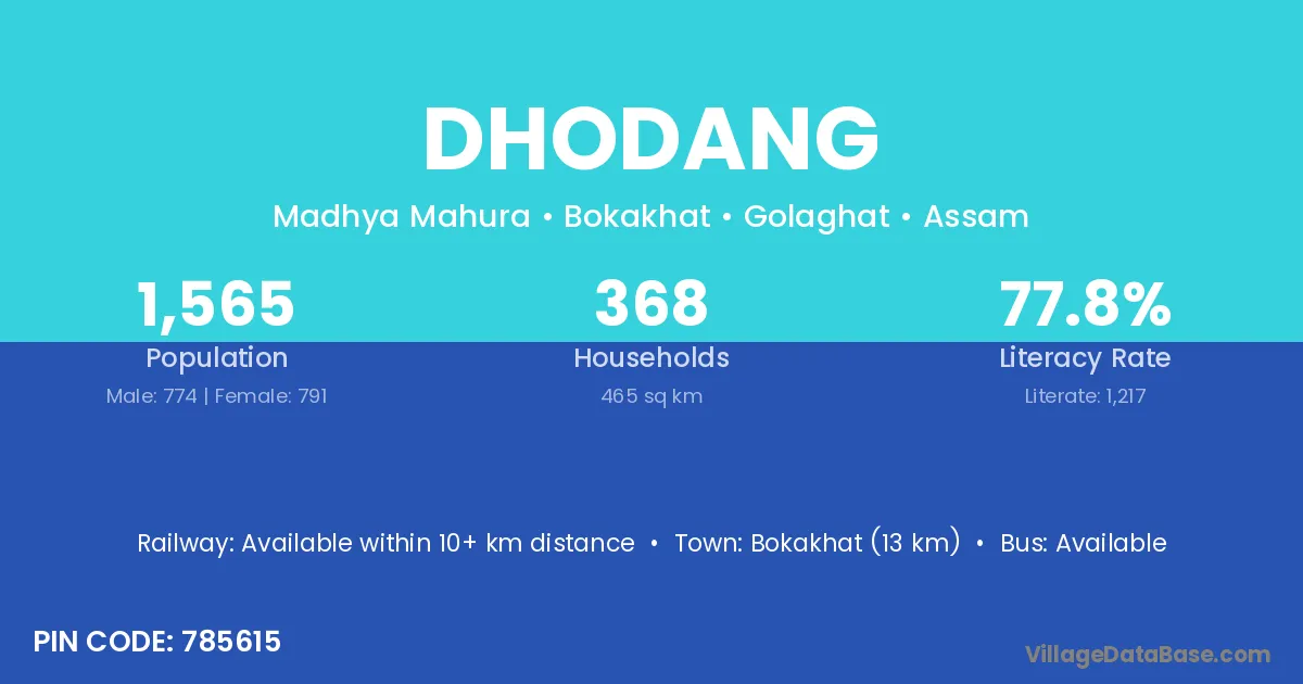 Bokakhat (13 km) is the nearest town to Dhodang village for major economic activities and is located approximately 13 km away.