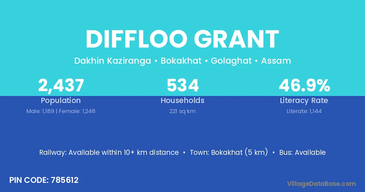 Bokakhat (5 km) is the nearest town to Diffloo Grant village for major economic activities and is located approximately 5 km away.
