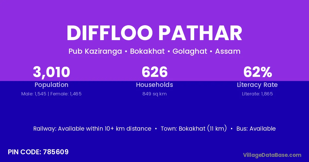Bokakhat (11 km) is the nearest town to Diffloo Pathar village for major economic activities and is located approximately 11 km away.