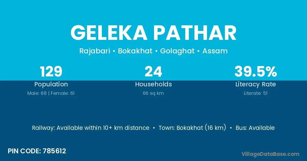 Bokakhat (16 km) is the nearest town to Geleka Pathar village for major economic activities and is located approximately 16 km away.