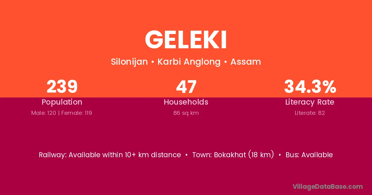 Bokakhat (15 km) is the nearest town to Geleki village for major economic activities and is located approximately 15 km away.