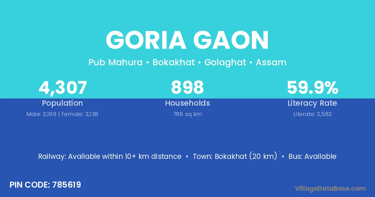 Goria Gaon village has a total population of 4,307 people, of which 2,169 are males and 2,138 are females.