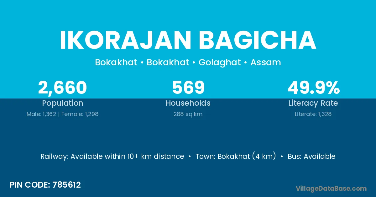 Bokakhat (4 km) is the nearest town to Ikorajan Bagicha village for major economic activities and is located approximately 4 km away.