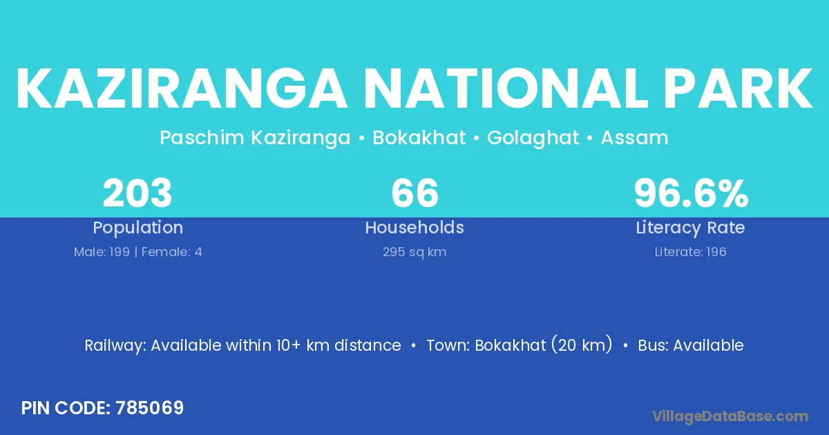 Kaziranga National Park village has a total population of 203 people, of which 199 are males and 4 are females.