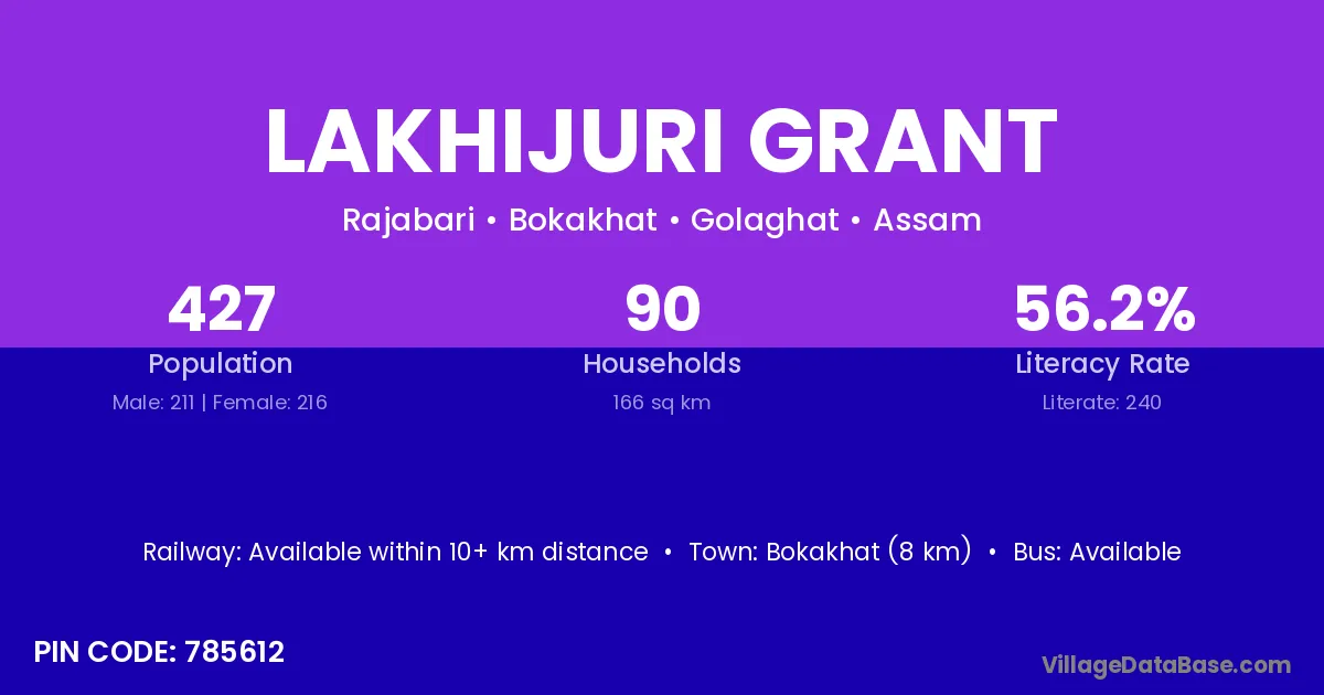 Bokakhat (8 km) is the nearest town to Lakhijuri Grant village for major economic activities and is located approximately 8 km away.