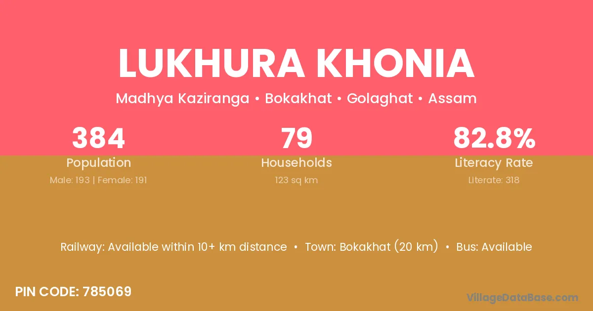 Bokakhat (20 km) is the nearest town to Lukhura Khonia village for major economic activities and is located approximately 20 km away.