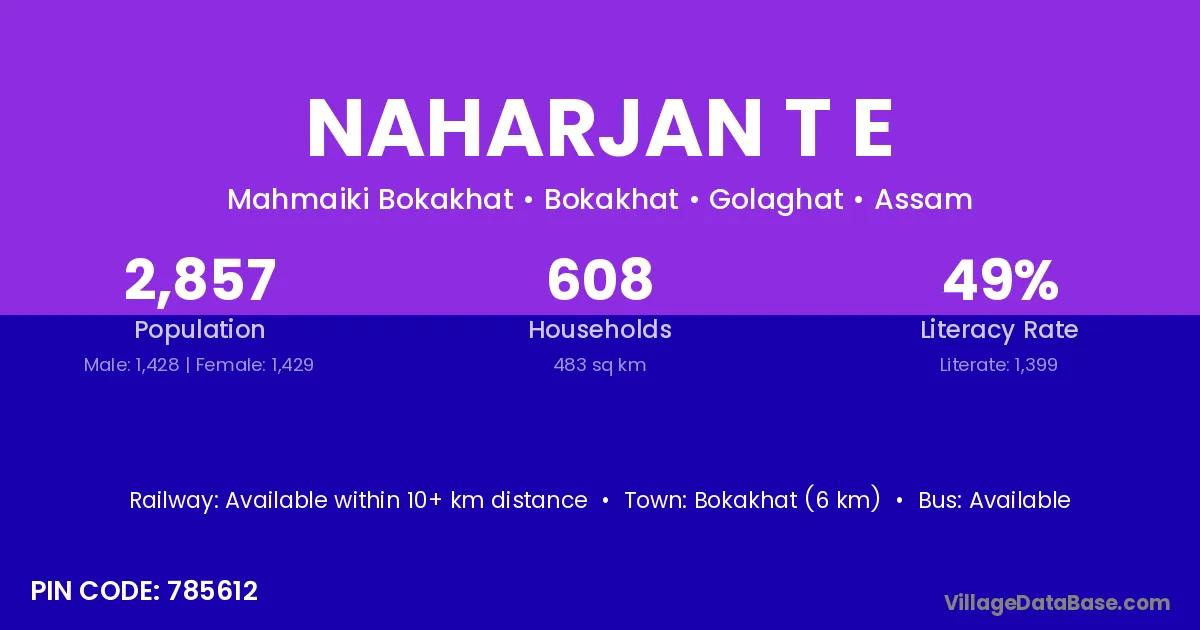 Bokakhat (6 km) is the nearest town to Naharjan T E village for major economic activities and is located approximately 6 km away.
