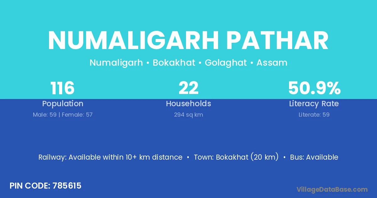 Bokakhat (20 km) is the nearest town to Numaligarh Pathar village for major economic activities and is located approximately 20 km away.