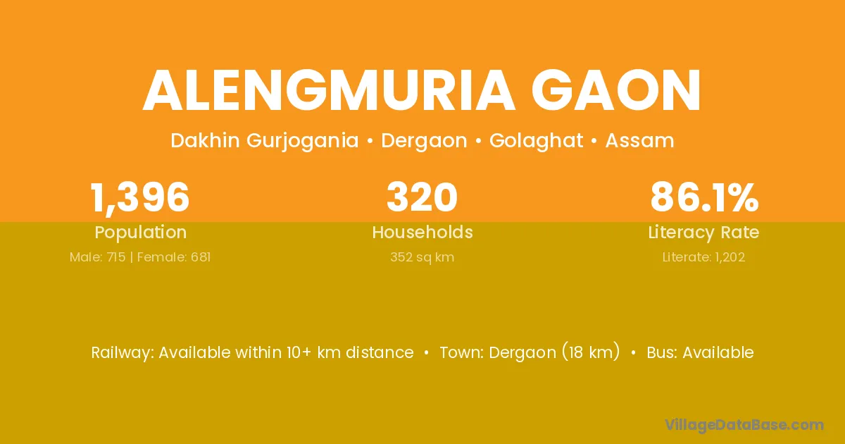 Dergaon (18 km) is the nearest town to Alengmuria Gaon village for major economic activities and is located approximately 18 km away.