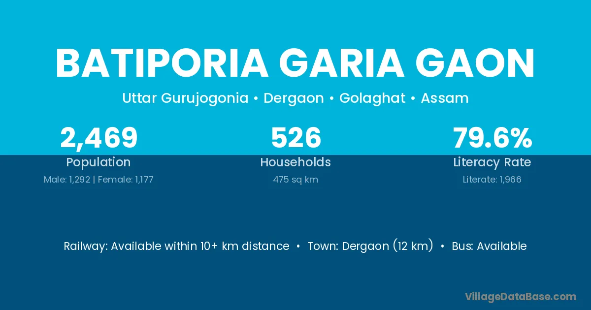 Dergaon (12 km) is the nearest town to Batiporia Garia Gaon village for major economic activities and is located approximately 12 km away.