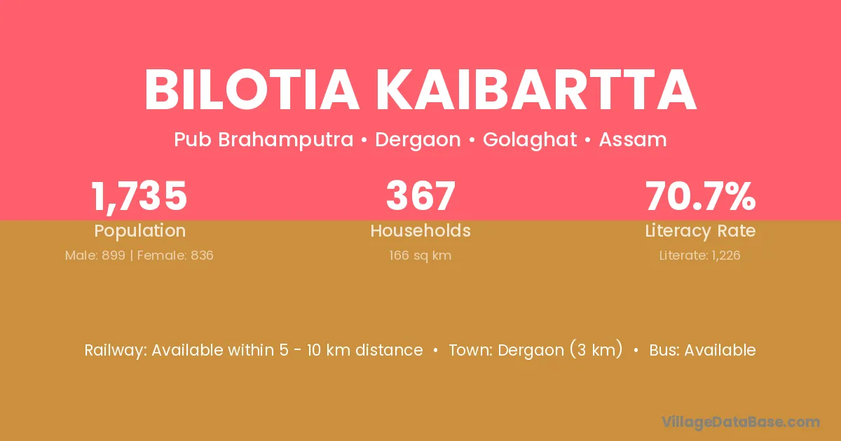Dergaon (3 km) is the nearest town to Bilotia Kaibartta village for major economic activities and is located approximately 3 km away.