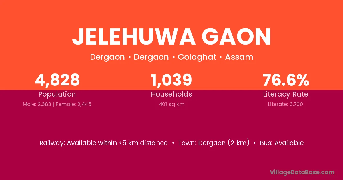 Dergaon (2 km) is the nearest town to Jelehuwa Gaon village for major economic activities and is located approximately 2 km away.