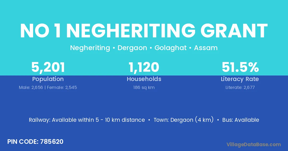 Dergaon (4 km) is the nearest town to No 1 Negheriting Grant village for major economic activities and is located approximately 4 km away.