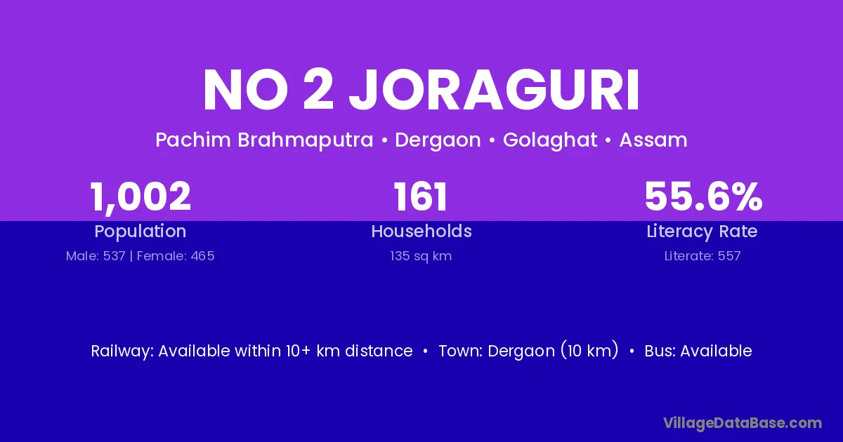 Dergaon (10 km) is the nearest town to No 2 Joraguri village for major economic activities and is located approximately 10 km away.