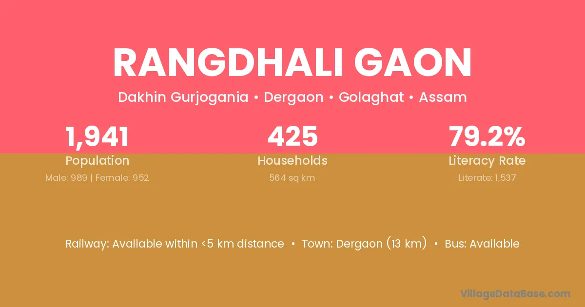 Rangdhali Gaon village has a total population of 1,941 people, of which 989 are males and 952 are females.