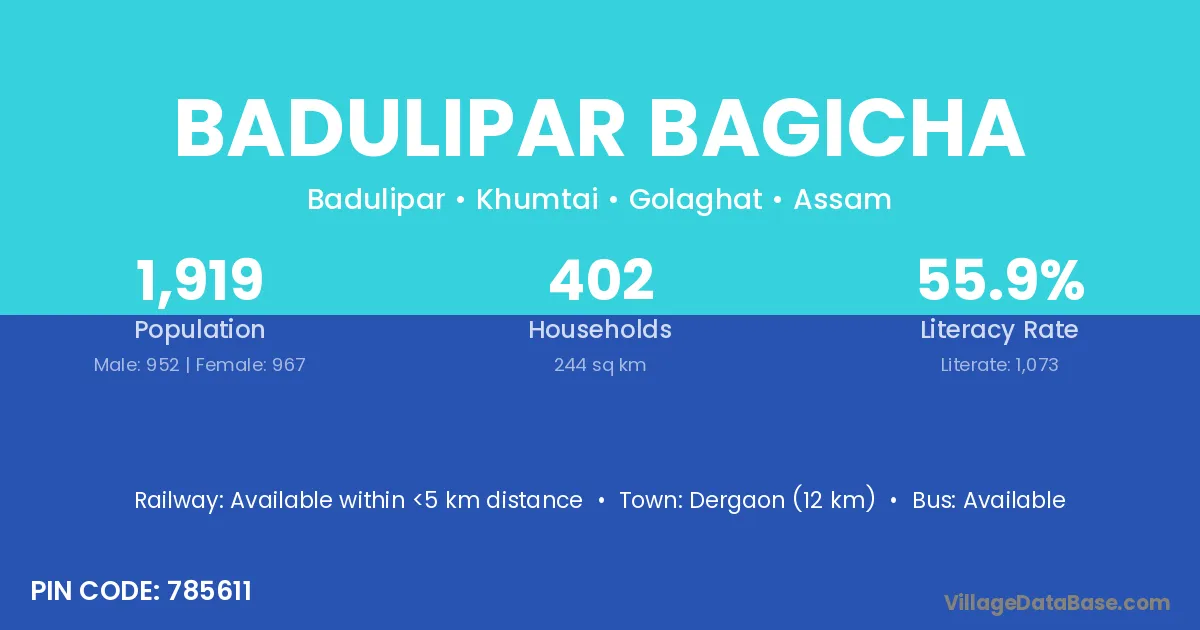 Dergaon (12 km) is the nearest town to Badulipar Bagicha village for major economic activities and is located approximately 12 km away.