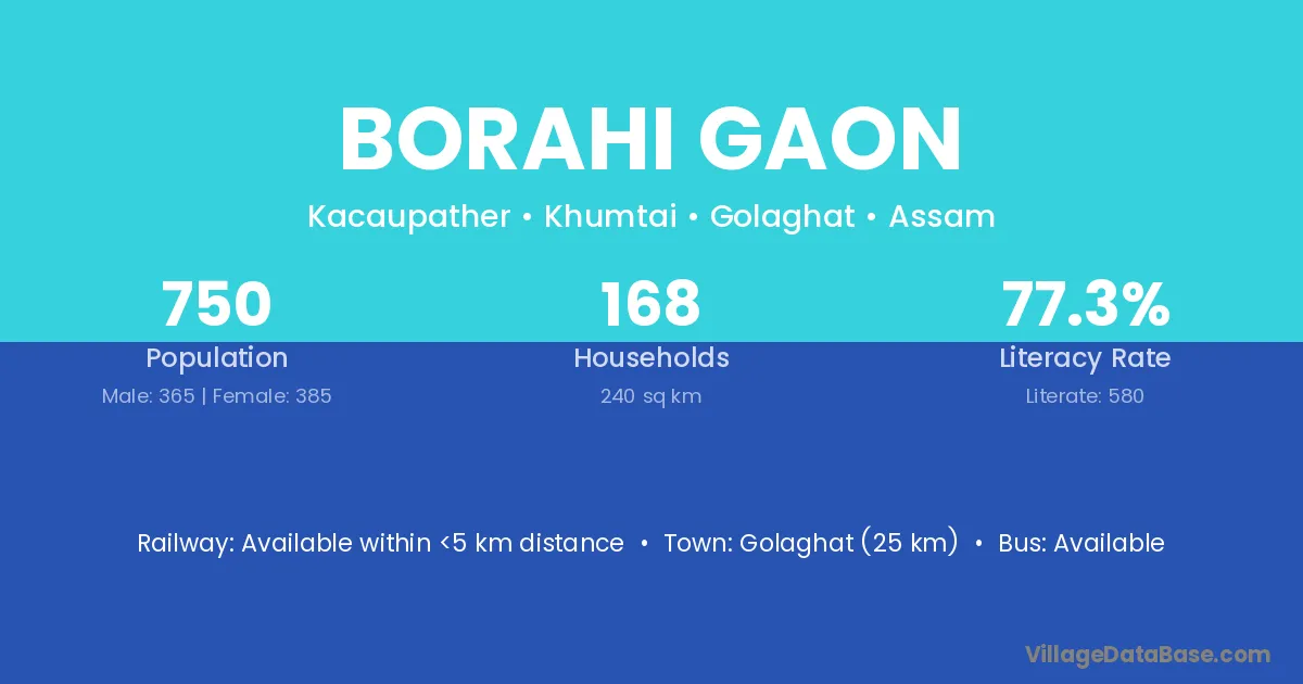 Golaghat (25 km) is the nearest town to Borahi Gaon village for major economic activities and is located approximately 25 km away.