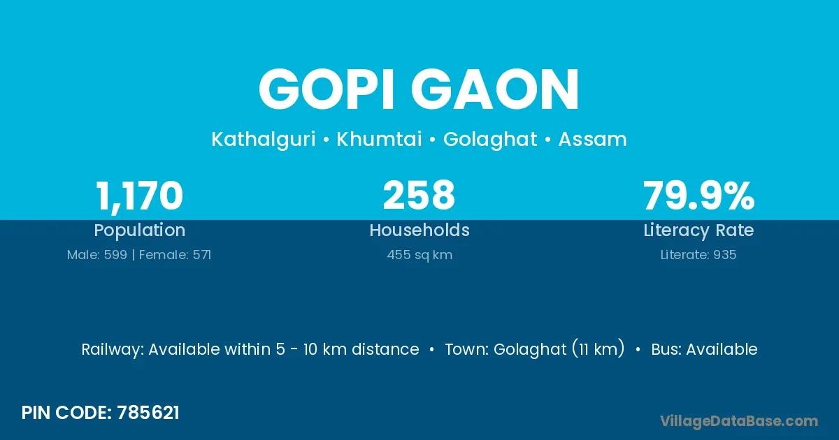 Golaghat (11 km) is the nearest town to Gopi Gaon village for major economic activities and is located approximately 11 km away.