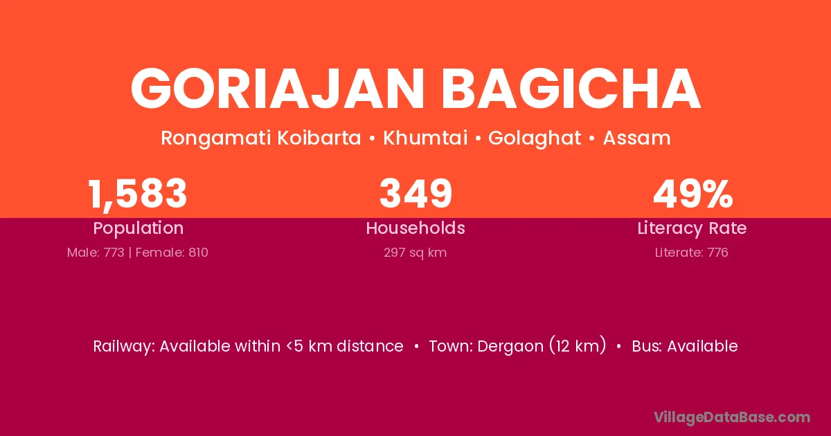 Dergaon (12 km) is the nearest town to Goriajan Bagicha village for major economic activities and is located approximately 12 km away.