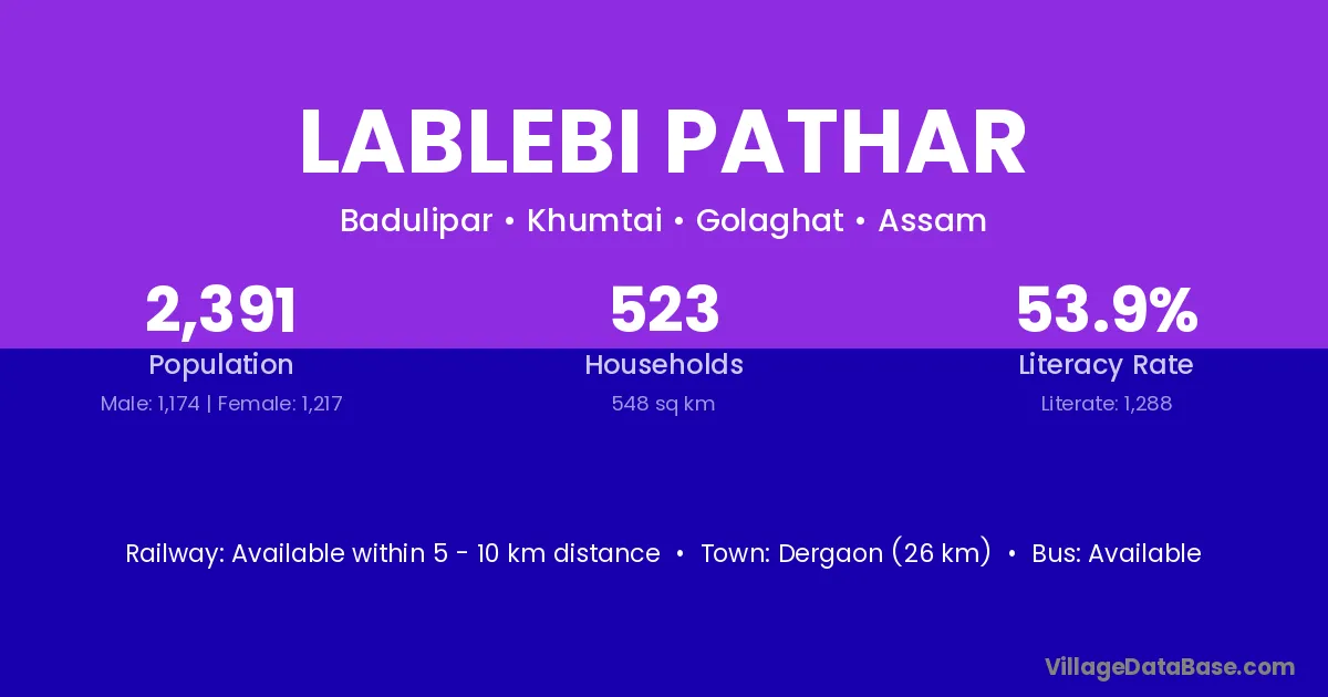 Dergaon (26 km) is the nearest town to Lablebi Pathar village for major economic activities and is located approximately 26 km away.