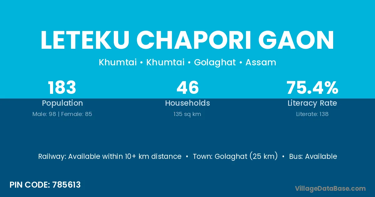 Leteku Chapori Gaon village has a total population of 183 people, of which 98 are males and 85 are females.
