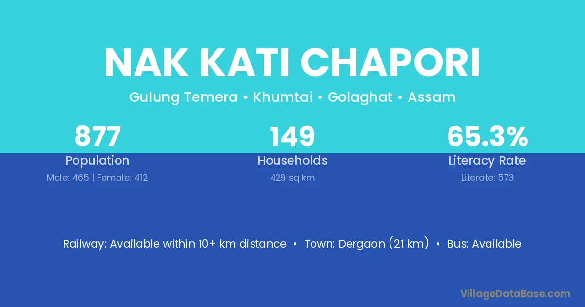 Dergaon (21 km) is the nearest town to Nak Kati Chapori village for major economic activities and is located approximately 21 km away.