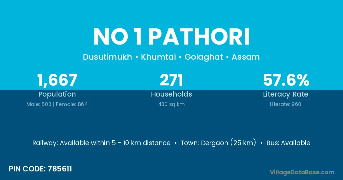 Dergaon (25 km) is the nearest town to No 1 Pathori village for major economic activities and is located approximately 25 km away.