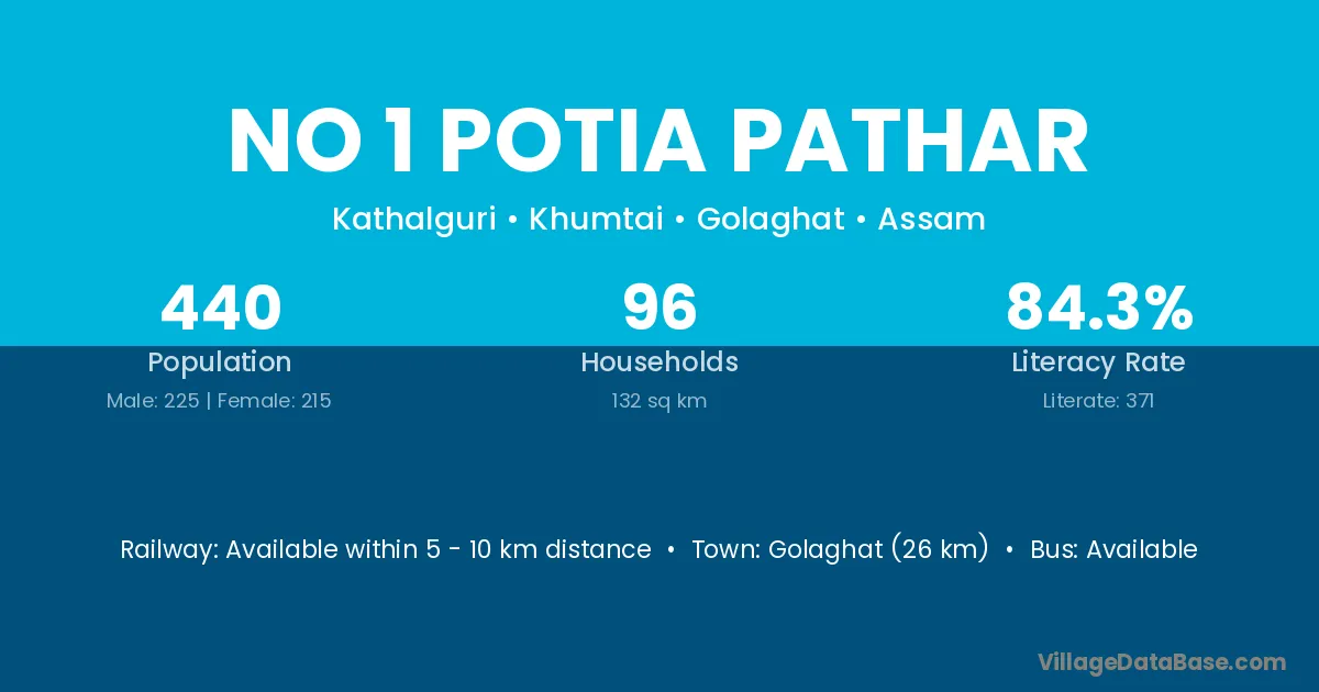 Golaghat (26 km) is the nearest town to No 1 Potia Pathar village for major economic activities and is located approximately 26 km away.