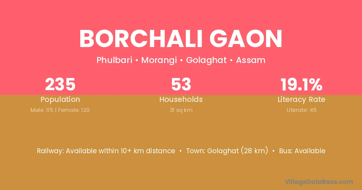 Golaghat (28 km) is the nearest town to Borchali Gaon village for major economic activities and is located approximately 28 km away.
