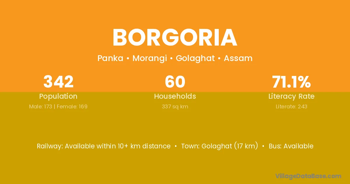 Golaghat (17 km) is the nearest town to Borgoria village for major economic activities and is located approximately 17 km away.