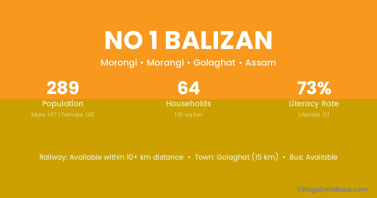 Golaghat (15 km) is the nearest town to No 1 Balizan village for major economic activities and is located approximately 15 km away.