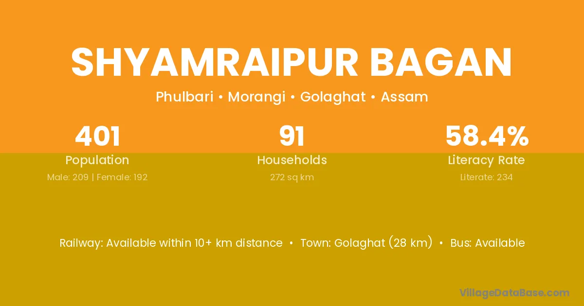 Golaghat (28 km) is the nearest town to Shyamraipur Bagan village for major economic activities and is located approximately 28 km away.