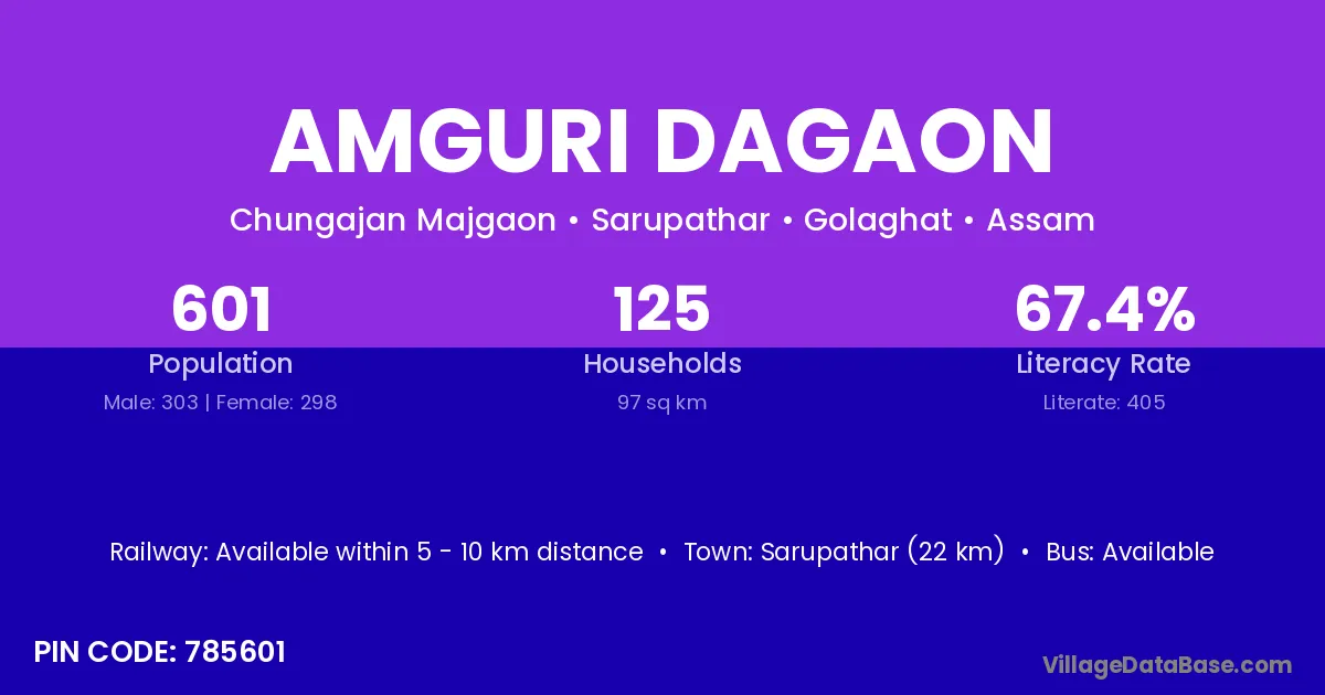 Amguri Dagaon village has a total population of 601 people, of which 303 are males and 298 are females.