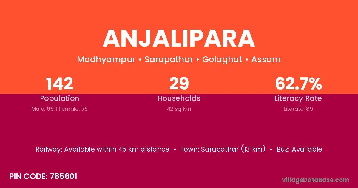 Sarupathar (13 km) is the nearest town to Anjalipara village for major economic activities and is located approximately 13 km away.