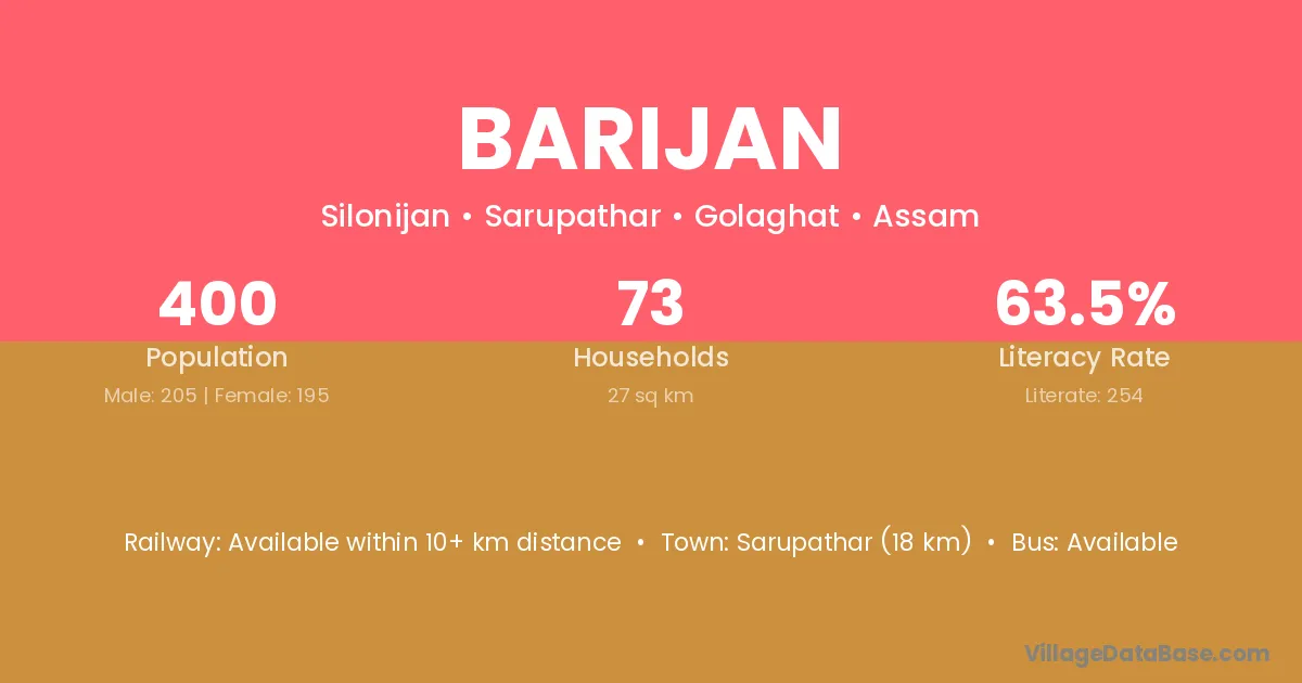 Sarupathar (18 km) is the nearest town to Barijan village for major economic activities and is located approximately 18 km away.