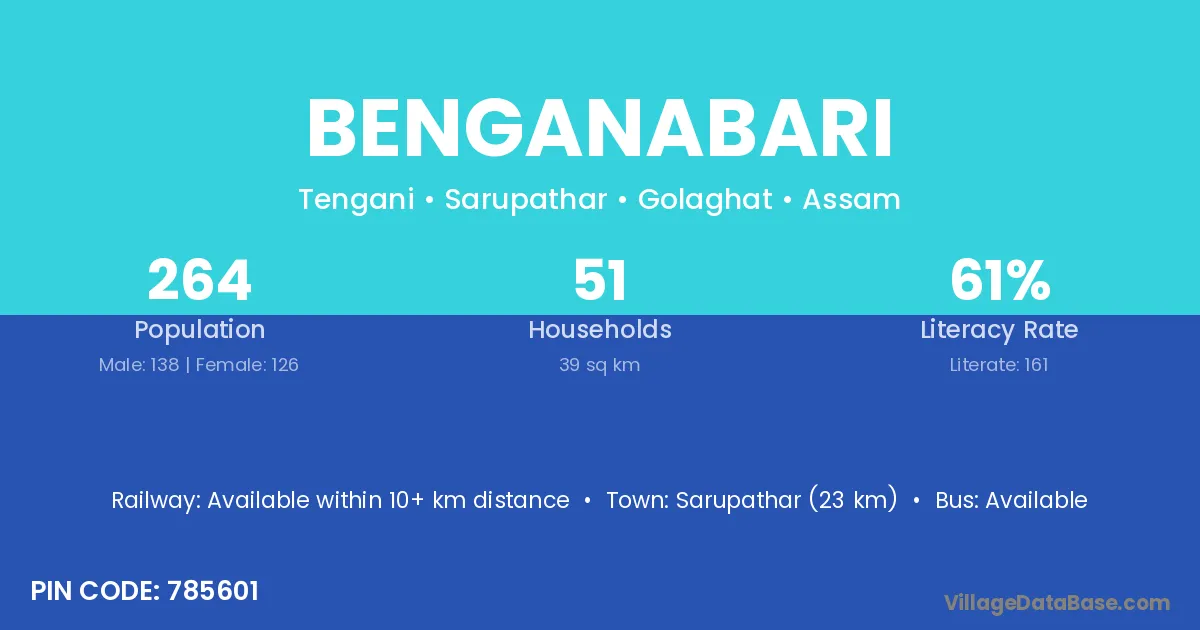 Sarupathar (23 km) is the nearest town to Benganabari village for major economic activities and is located approximately 23 km away.