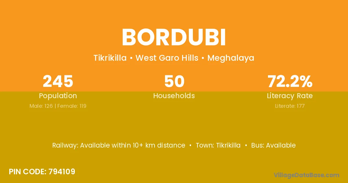 The literacy rate of Bordubi village is 70.38%. Male literacy stands at 71.22% and female literacy at 69.53%.