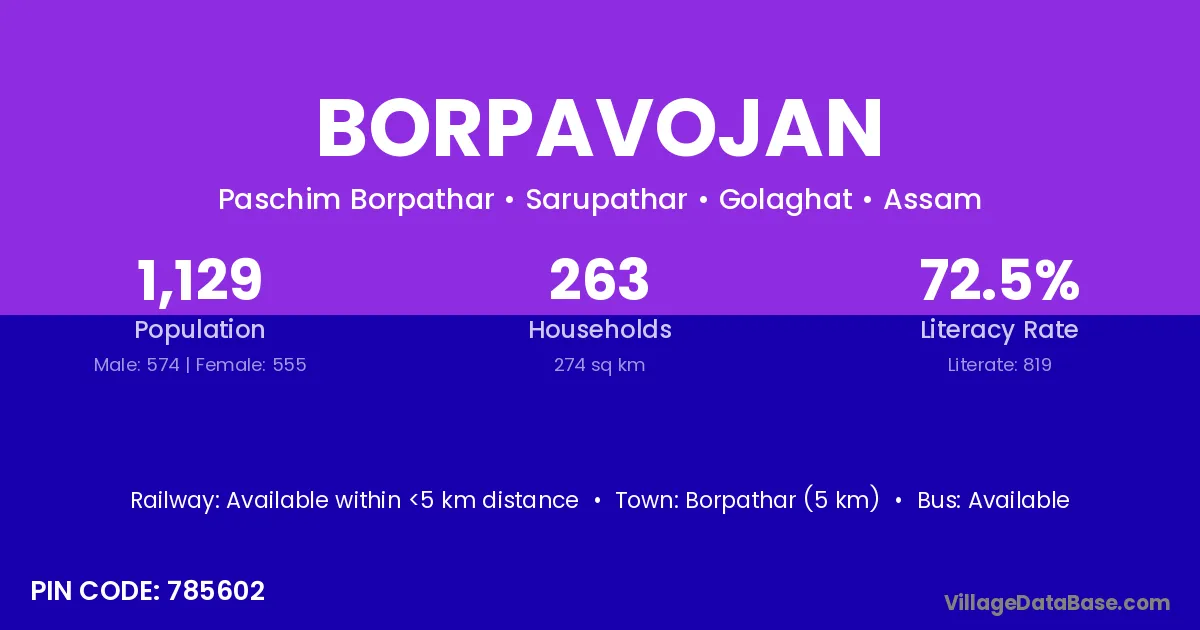 Borpathar (5 km) is the nearest town to Borpavojan village for major economic activities and is located approximately 5 km away.