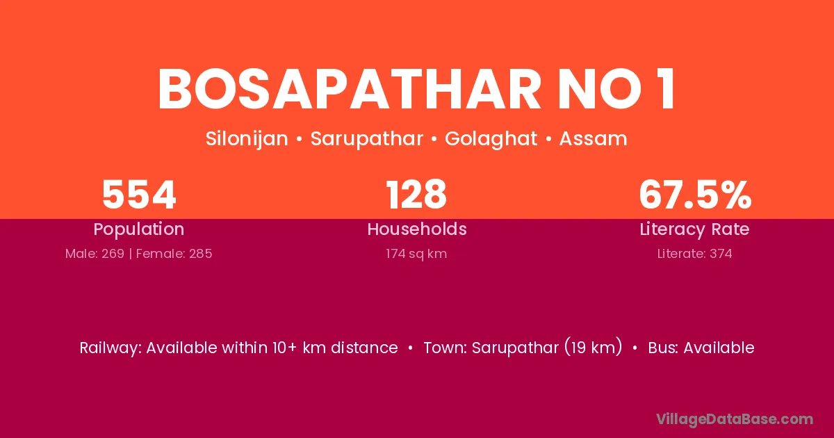 Bosapathar No 1 village has a total population of 554 people, of which 269 are males and 285 are females.