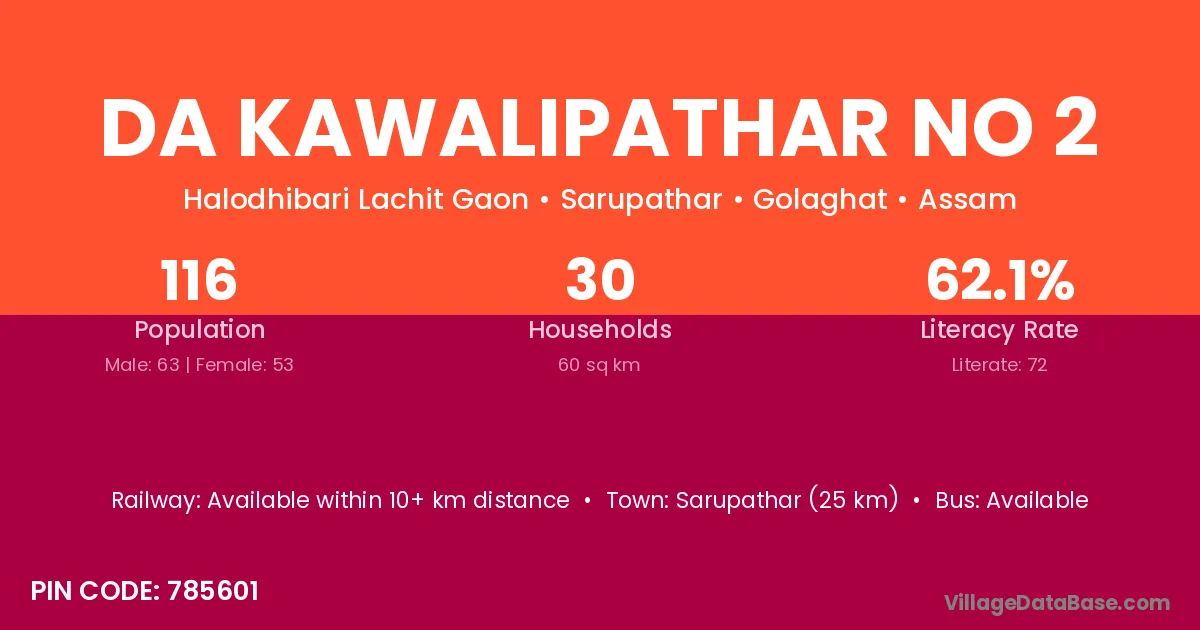 Sarupathar (25 km) is the nearest town to Da Kawalipathar No 2 village for major economic activities and is located approximately 25 km away.