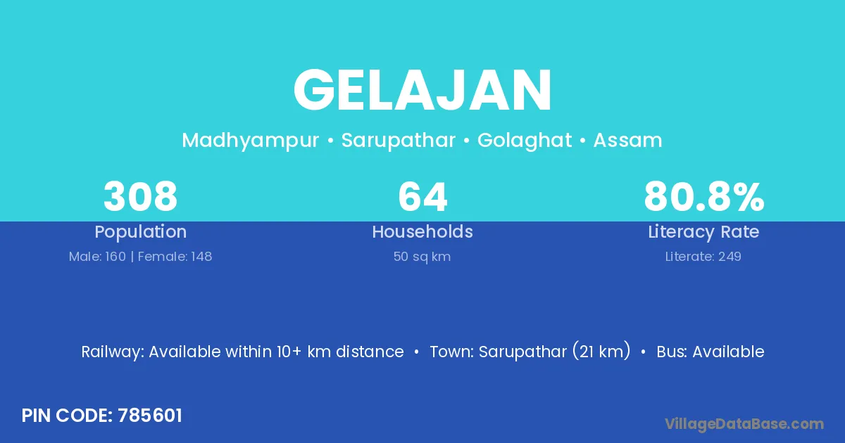 Sarupathar (21 km) is the nearest town to Gelajan village for major economic activities and is located approximately 21 km away.