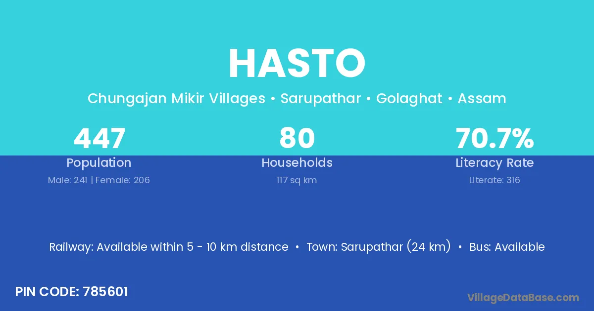 Sarupathar (24 km) is the nearest town to Hasto village for major economic activities and is located approximately 24 km away.