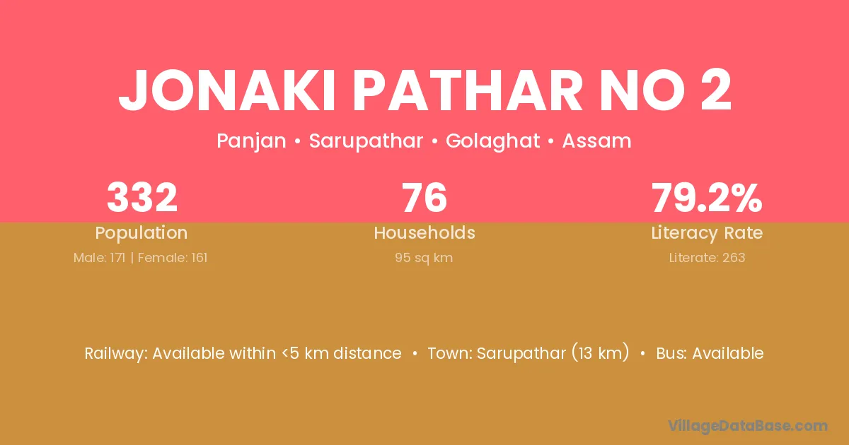 Jonaki Pathar No 2 village has a total population of 332 people, of which 171 are males and 161 are females.