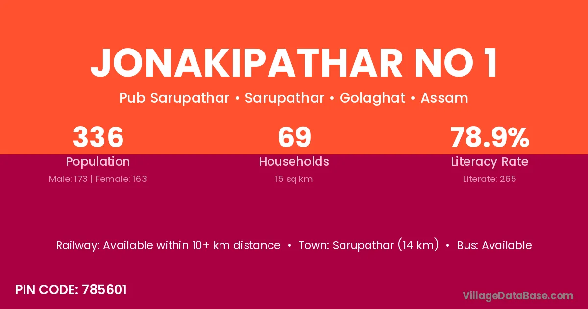 Sarupathar (14 km) is the nearest town to Jonakipathar No 1 village for major economic activities and is located approximately 14 km away.