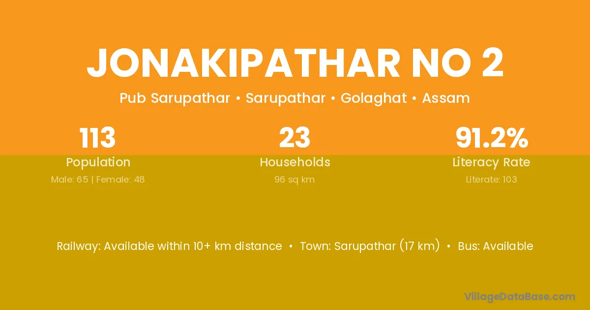 Sarupathar (17 km) is the nearest town to Jonakipathar No 2 village for major economic activities and is located approximately 17 km away.
